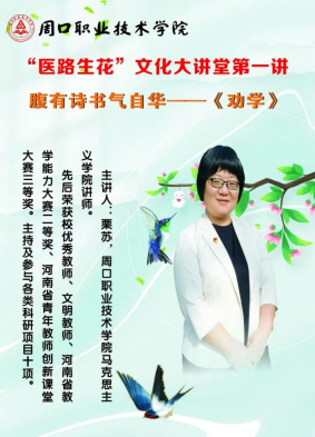 2022年4月12日下午,bevictor伟德官网宣讲团成员栗苏老师在东校区多媒体教室为“医路生花——文化大讲堂”系列活动作题为“腹有诗书气自华——劝学”的讲座。