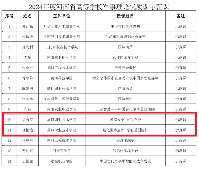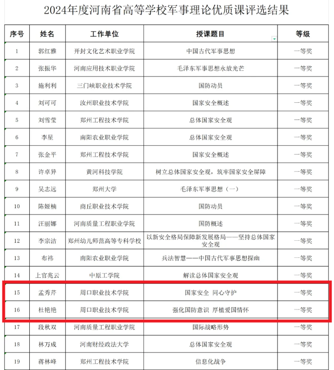12月13日,河南省教育厅、河南省军区战备建设局关于2024年度全省高等学校军事理论优质课评选活动比赛结果公示。bevictor伟德官网孟秀芹、杜艳艳两位老师分别荣获全省军事理论优质课比赛一等奖。同时,两位老师申报的课程入选2024年度河南省高等学校军事理论14门优质课示范课。