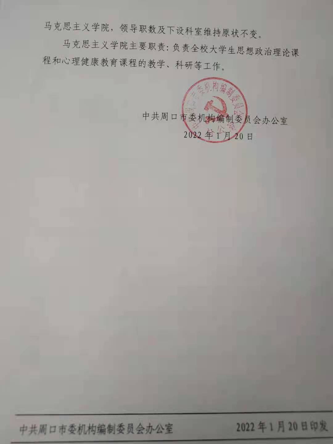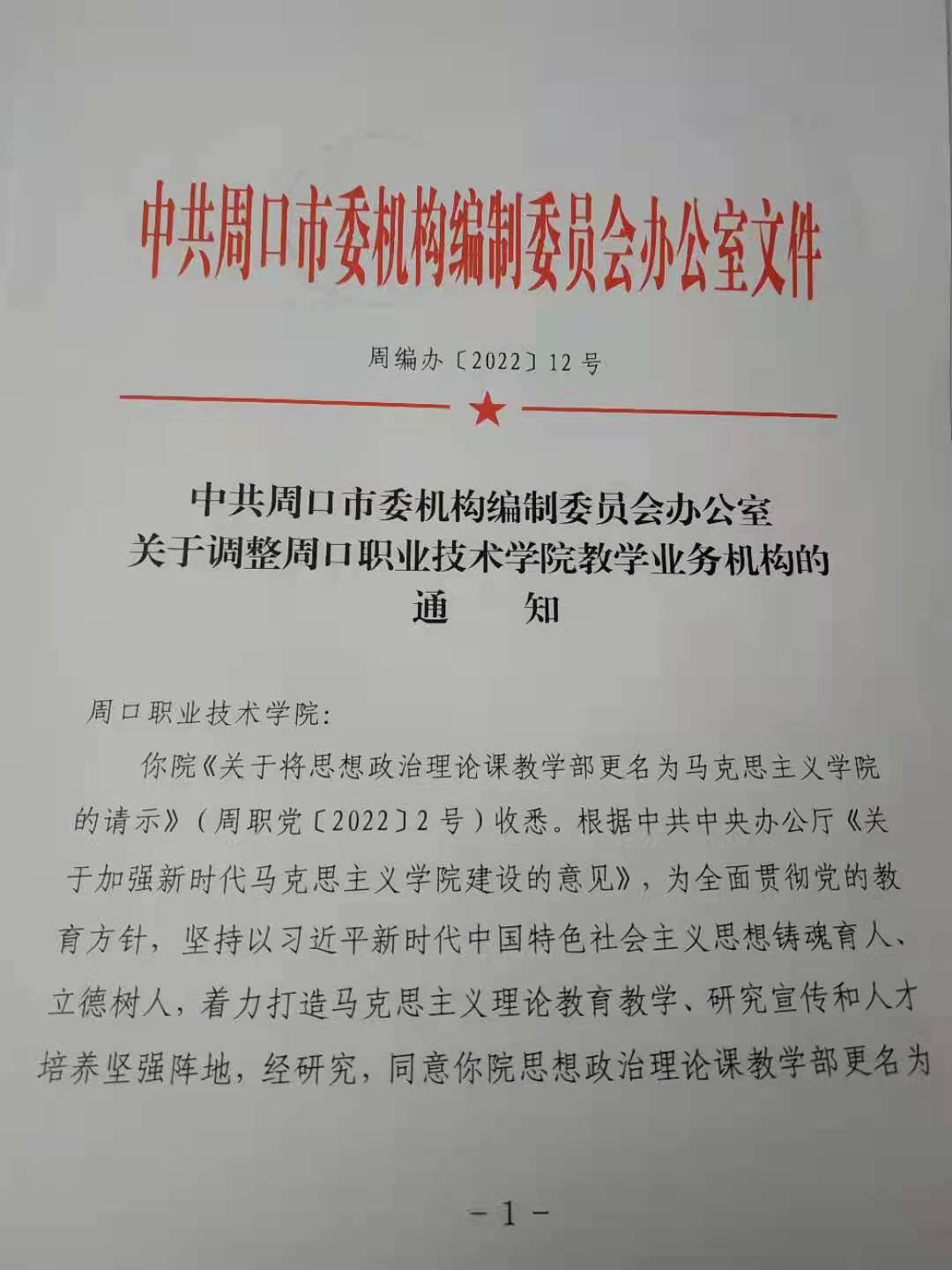 中共周口市委机构编制委员会办公室关于调整周口职业技术学院教学业务机构的通知