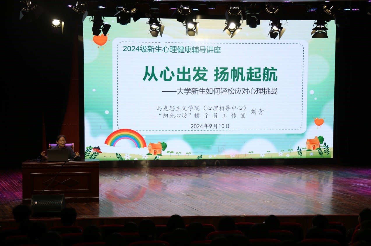 为了让大一新生更好地适应大学生活,提高其心理健康意识,我校于2024年9月10日在励德厅举办了一场以“从心出发 扬帆起航”为主题的心理健康辅导讲座。本次讲座由我校bevictor伟德官网心理指导中心刘青老师主讲,我校2024级全体新生通过现场聆听和线上学习相结合的方式参与了该讲座。