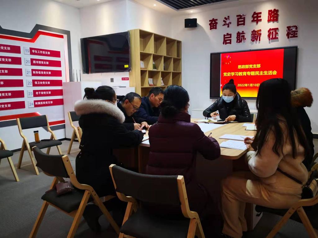 1月10日上午,思政部党支部召开党史学习教育专题民主生活会。会议紧扣“学党史、悟思想、办实事、开新局”的主题,按照“学史明理、学史增信、学史崇德、学史力行”的要求,交流学习体会,检视差距不足,明确整改措施,推动党史学习教育落向实处。
