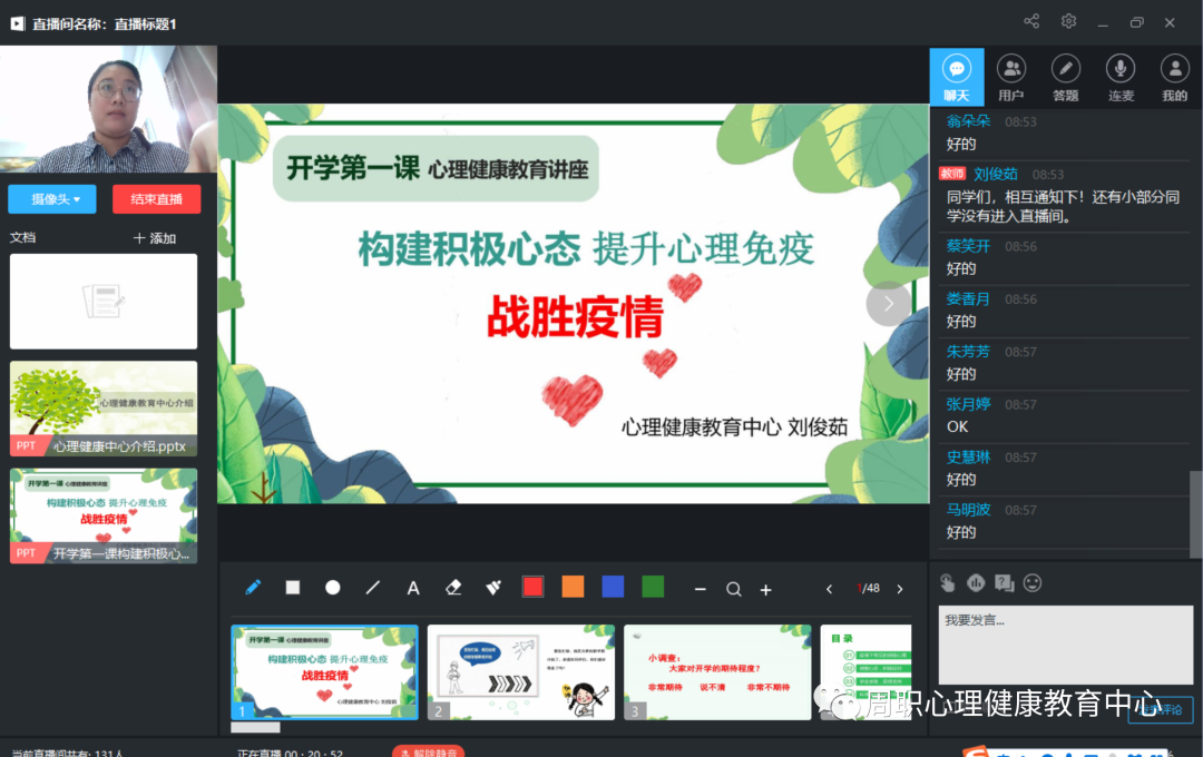 刘俊茹老师主要从四个模块与同学们进行了交流。在“疫情下常见的消极心理”模块中,刘老师和同学们一起回顾了在居家防疫期间所发生的点点滴滴,引导学生去感知生活中所遇到的各种心理问题与矛盾,并从中收获成长。在“调整心态,积极应对”模块中,刘老师从做好个人防护、觉察自己的身心反应、调整自己的认知以及积极的自我调节等方面与同学们交流,希望同学们能够学会关注身边的美好事物,用积极的心态面对学习与生活。在“学会求助,获得支持”模块中,刘老师为同学们说明了需要寻求心理援助的表现,并简单介绍了我校心理健康教育中心各功能室,希望同学们在遇到心理问题时能够及时向校心理中心寻求心理援助。在“科学做好停课不停学”的模块中,刘老师提出四点建议:“学习时间,屏蔽手机”、“缓急相济,合理利用”、“及时奖赏,有收获感”和“确定目标,每天检查”,激励同学们在即将重新开始的校园生活中,以积极、进取、平和的心态去面对可能出现的各种困难,并且学会给自己最好的关爱。