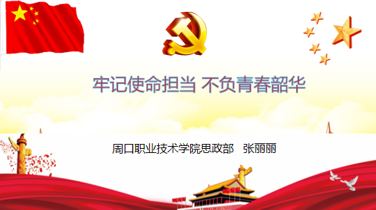 2021年秋季新学期,因为疫情的影响,2021级新生无法正常报到。按照学校教务处的工作安排,922日到24日周口职业技术学院思政部思政课教师张丽丽面向2021级护理学院全体学生开展线上“思政开学第一课”。她的授课题目是“牢记使命担当 不负青春韶华”。
