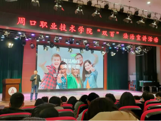 思政部教师、“双百”法治宣讲团成员张大书应邀作《学习习近平法治思想,做新时代阳光守法大学生》专题报告。张老师从伟大复兴的光明前景、法治社会的时代课题、做新时代阳光守法大学生三个方面进行深刻讲述。他联系实际,深入浅出,以案释法、以法论事,使在场的师生增长了法治理论知识,增强了走社会主义法治道路的信心。